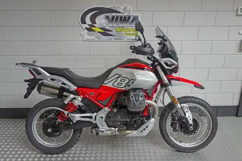 De Moto Guzzi V85 TT is de "all-terrain" motorfiets die de oorspronkelijke geest van de V85 belichaamt, met een zeer suggestief uiterlijk en styling die teruggrijpt naar de sferen van de jaren 80 en de enduromotoren waarmee je alles kon doen, van alledaags vervoer tot avontuurlijke reizen. Hij is uitgerust met spaakwielen die plaats bieden aan tubeless banden van 17" en 19" (respectievelijk 150/70-17 en 110/80-19), maten die zelfs off-road liefhebbers tevreden zullen stellen. Bovendien wordt de motor afgeschermd door een nieuwe aluminium beschermplaat en zijn de handgrepen voorzien van verbeterde, beter beschermende handkappen. De Moto Guzzi V85 TT valt op door zijn rood gespoten frame, gecombineerd met de suggestieve tweekleurige Rosso Fuji en Grigio Tambora kleurstelling. Zelfs de veer van de achter schokdemper is rood en kan eenvoudig worden ingesteld met een handige knop.